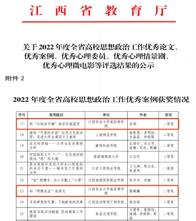 近日,根据省教育厅《关于2022年度全省高校思想政治工作优秀论文、优秀案例、优秀心理委员、优秀心理情景剧、优秀心理微电影等评选结果的公示》,我院外语系吴琼老师的优秀案例《把“公检法诈骗”扼杀在摇篮里》、人文与艺术系黎麒麟老师的优秀案例《和“网瘾先生”说再见》均荣获全省高校思想政治工作优秀案例二等奖。据悉,本次全省经过学校推荐、专家评审,共计评选优秀案例52篇,我院上报的2篇全部获奖,这也是我院近年来在这类活动中的最好成绩。