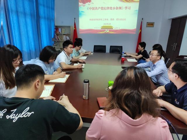 为深入学习贯彻党的二十大精神,提高纪律意识,加强纪律建设,4月20日上午,学工处、团委与招就处一同在笃行楼320室开展《中国共产党纪律处分条例》专题学习会。