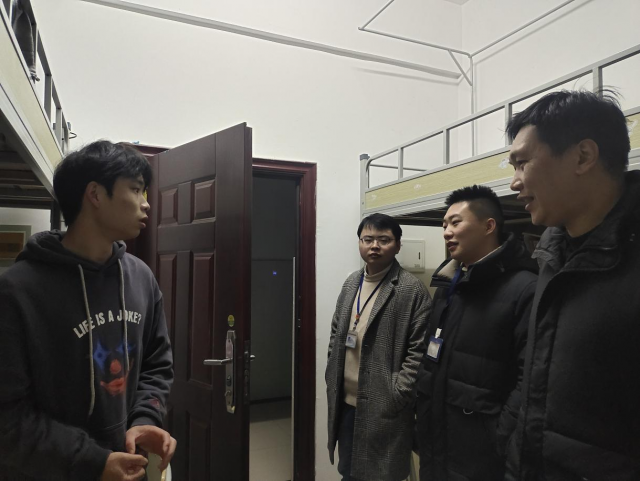在调研学生社区楼栋安全时,李海峰副书记叮嘱学生要注意寝室卫生、多通风,要学会安全用电,在生活和学习上有疑问和困难时,及时主动找辅导员或学工老师寻求帮助。并强调要有安全防范意识,养成良好的生活习惯,遵守学校规章制度,锤炼过硬本领,争做新时代好青年。同时对宿管阿姨强调要经常性开展安全隐患排查,多关心楼栋学生生活,共同营造美好的学习生活环境。